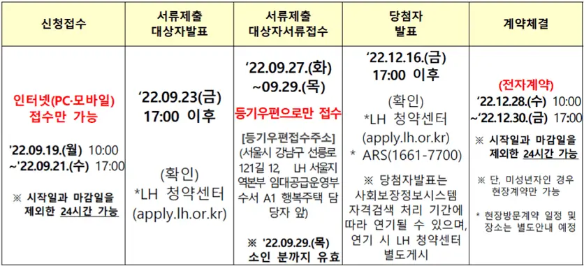 • 청약 신청자는 서류제출대상자 발표일 (2022. 09. 23. (금) 17시 이후)에 서류제출대상자로 선정되었는지 여부를 직접 확인하여야 하며, 선정된 분은 반드시 서류제출기간 [2022. 09. 27. (화) ~ 09. 29. (목)]에 필요서류를 등기우편으로 제출하여야 합니다. (기간 내 미제출 시 ‘청약의사 없음으로 간주’되어 탈락처리)