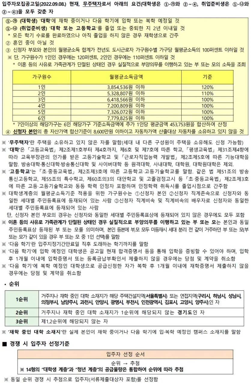 ※ “대학생 계층” 및 “청년 계층”은 모집공고일부터 입주시까지 무주택자이어야 합니다.