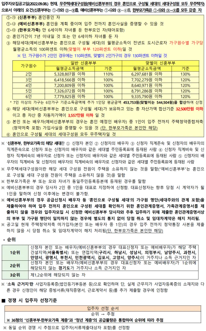 – 신혼부부 : 공고일 현재 혼인중이며 혼인기간이 7년 이내이거나 만6세 이하의 자녀를 둔 사람
