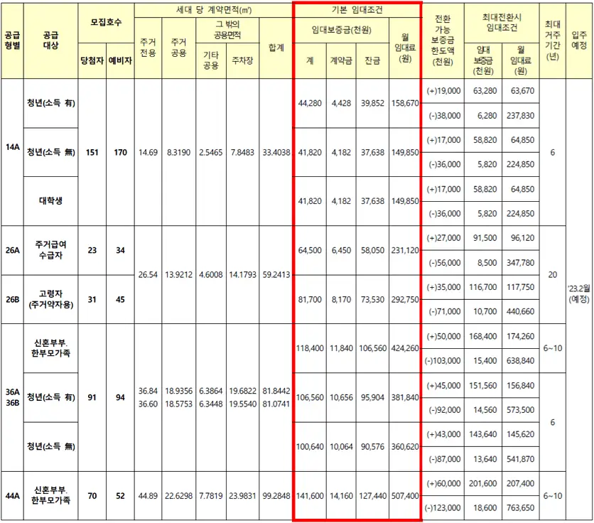 • 위 임대조건의 임대보증금 및 월임대료는 입주자모집공고일 현재 기준이며, 예비입주자로 선정된 분은 추후 공가가 발생하여 임대차계약을 체결하게 되는 시점의 주변시세를 반영한 변경 임대조건이 적용됩니다.