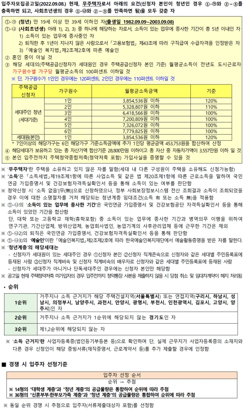 • 수서역세권 A1 행복주택은 입주자모집공고일 (2022. 09. 08) 현재 다음 중 하나에 해당하는 사람에게 공급됩니다. [신청자격별 세부 자격요건은 공고문 본문 (신청자격)을 확인하시기 바랍니다.]