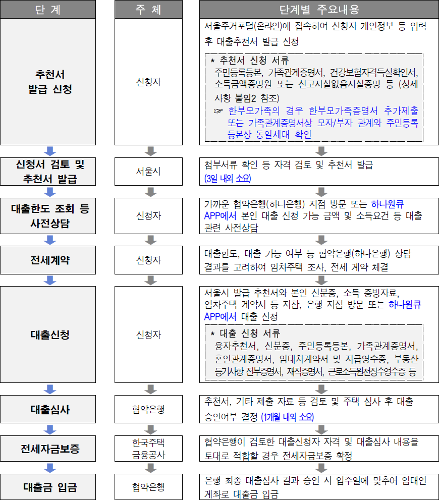 | 추천서 발급 문의 | 서울시 다산콜센터 ☎ 02-120, 서울시 주택정책과 주택금융지원팀 ☎ 02-2133-7034 |