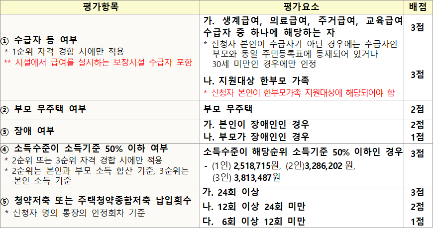 아래의 배점을 합산하여 총점이 높은 순으로 입주대상자를 선정하되, 동일 점수인 경우 다음 각 호의 순서에 따라 점수가 높은 순으로 입주대상자 선정 (경합 발생 시 추첨으로 우선순위 결정)