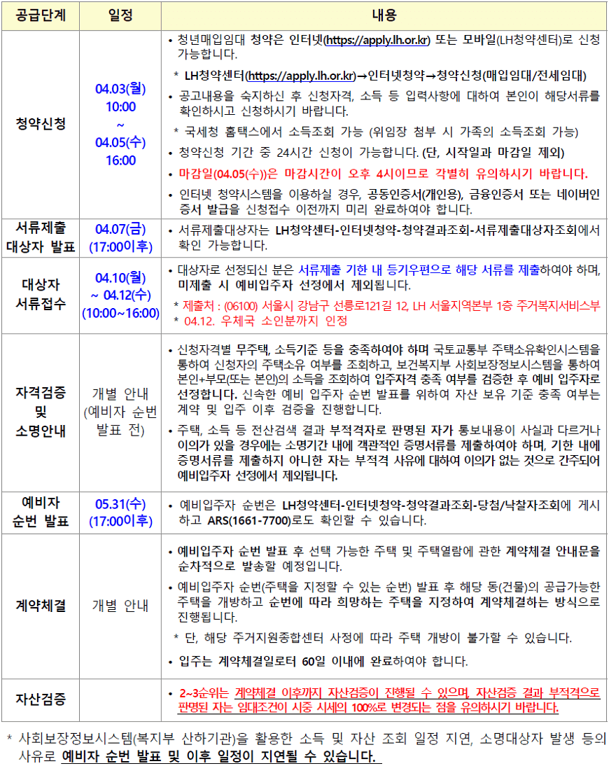 – 단, 계약체결 이후 자산검증이 진행될 수 있으며, 자산검증 결과 부적격자로 판명되는 자는 임대조건이 시중 시세의 100%로 변경되는 점을 유의하시기 바랍니다.