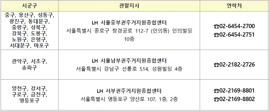 한국토지주택공사 콜센터 ☎ 1600-1004, 서울지역본부 매입임대 상담센터 ☎ 02-2015-1040