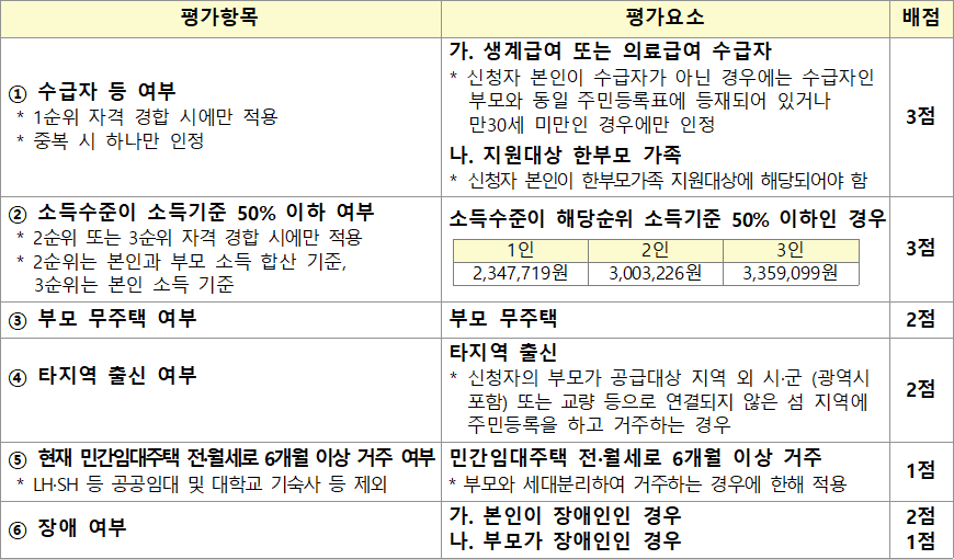 • 순위에 따라 입주자를 선정하되, 경쟁(경합) 시 아래의 배점합산 점수가 높은 신청자 순으로, 동점일 경우 아래 각 평가항목의 순서에 따라 점수가 높은 자가, 동일 순서에서 점수가 동일할 경우 추첨으로 입주자를 결정합니다. (① 순위 → ② 배점 → ③ 아래 각 평가항목의 순서에 따라 점수가 높은 자 → ④ 추첨)