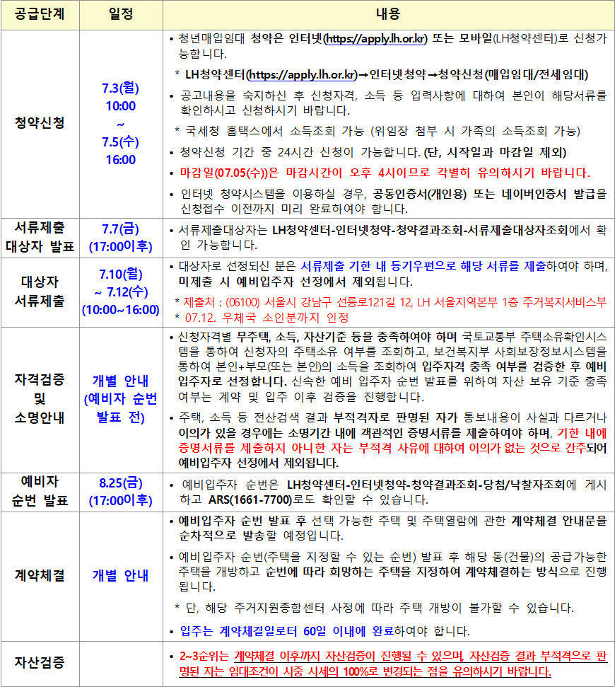 – 단, 계약체결 이후 자산검증이 진행될 수 있으며, 자산검증 결과 부적격자로 판명되는 자는 임대조건이 시중 시세의 100%로 변경되는 점을 유의하시기 바랍니다.