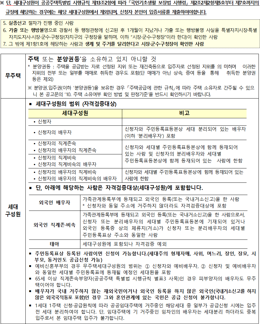 – 입주자격 중 주택, 소득, 부동산, 자동차, 일반자산, 금융부채 외 부채의 산정시점은 입주자모집 공고일이며, 금융자산 및 금융부채의 산정시점은 조사기준일입니다. 다만, 사업주체가 입주대상자 확정을 목적으로 사회보장정보시스템을 통해 확인한 입주자격은 해당 산정시점에 산정된 것으로 간주합니다.
