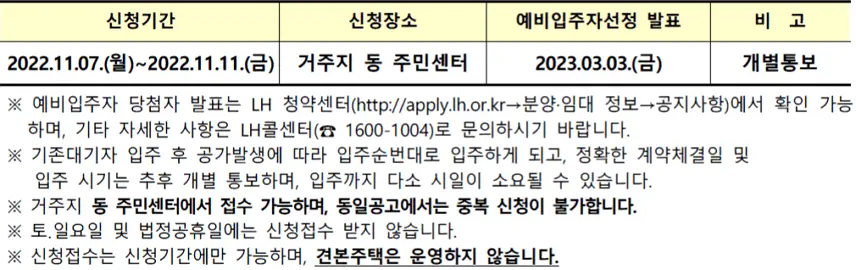 • 예비입주자가 공공임대주택 (국민ㆍ영구ㆍ행복)에 계약 후 입주한 경우에는 다른 공공임대주택 입주대기자 명부에서 제외처리 되오니 신청 시 유의하시기 바랍니다.