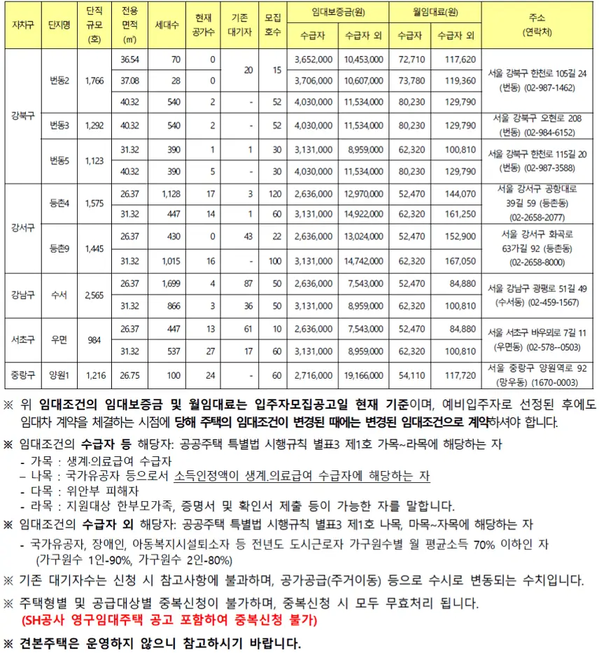 LH 서울특별시 영구임대주택 모집공고입니다. 금회 모집의 예비입주자로 선정될 경우 입주 순번은 기존대기자의 후 순번이 되며, 공가발생 시 예비입주자 순번에 따라 계약을 체결하므로, 실제 아파트 입주까지는 상당기간이 소요 (1년 이상)될 수 있습니다. 1세대 (무주택세대구성원 전원) 1주택만 신청 가능하며, 중복 신청하는 경우 전부 무효처리 됩니다. (신청을 원하시는 1개단지 1개 평형만 신청 가능합니다.)