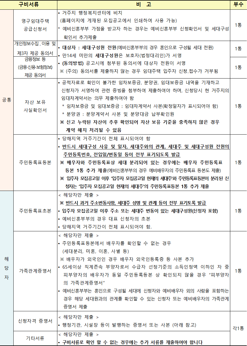 • 예비입주자 모집 공고일은 2022.10.28.(금)입니다. 이는 입주자격 (무주택세대구성원 등) 및 배점 등의 판단 기준일이 되며, 모든 제출서류는 모집공고일 (2022.10.28.) 이후 발급분 이어야 합니다.