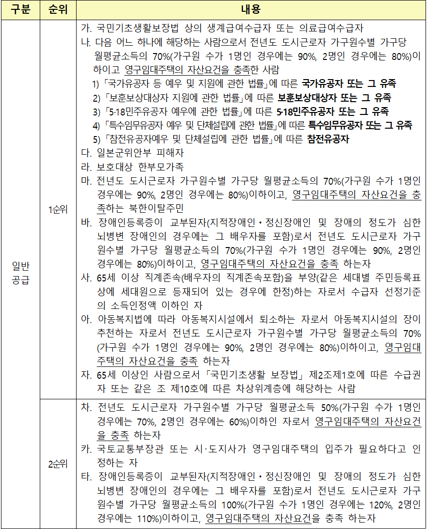 • 영구임대주택 신청자격은 모집공고일 (2022.10.28.) 현재 서울특별시에 거주하는 무주택세대구성원으로 영구임대아파트 입주자 자격에 해당되며 소득 및 자산 기준을 충족하는 사람에 한 합니다.