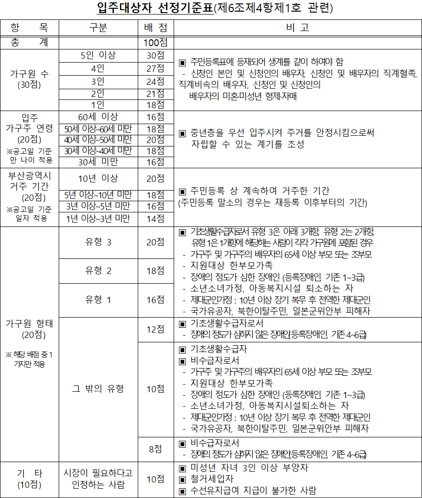 ■ 입주대상자 선정 (배점) 기준표 (「서울특별시 공공임대주택 운영 및 관리규칙」제4조제1항)