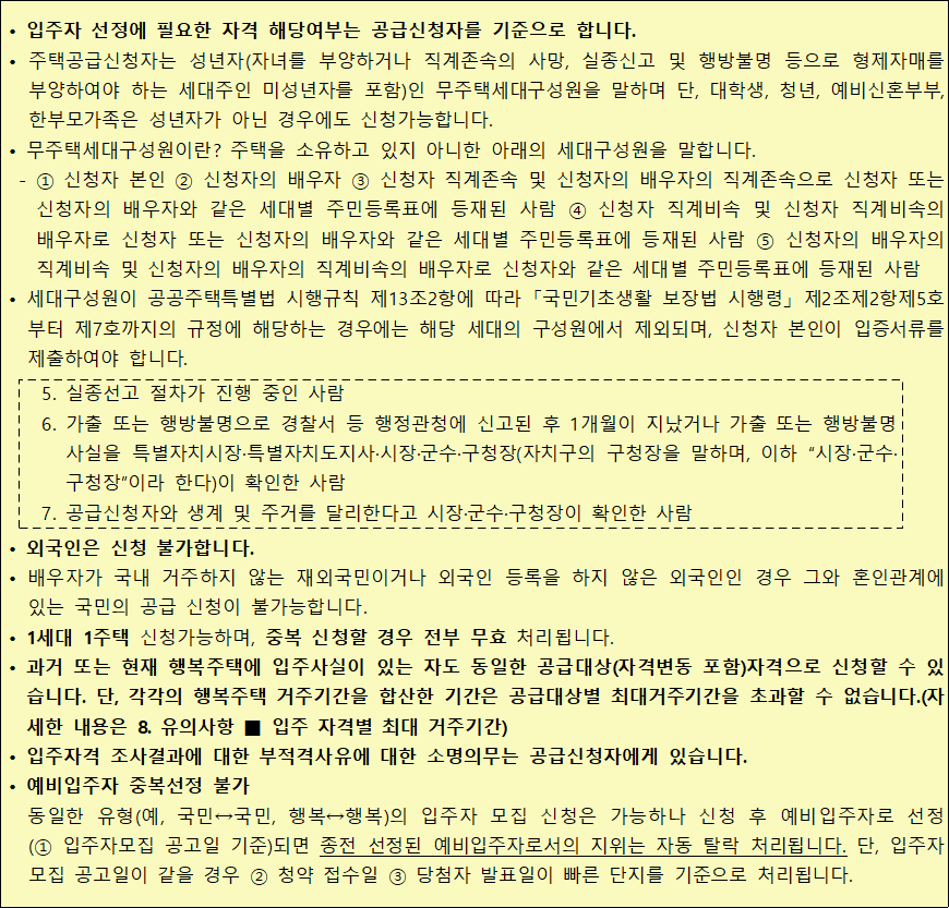 ※ 예비입주자가 공공임대주택에 계약 후 입주한 경우 다른 공공임대주택 (국민·영구·행복) 입주대기자 명부에서 제외됩니다. 단, 입주여부는 실 입주일을 말하며, 입주지정기간 후는 임대보증금 완납으로 판단합니다.