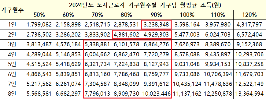 소득기준월평균소득의 70%이하 (1인가구 90%, 2인가구 80%)