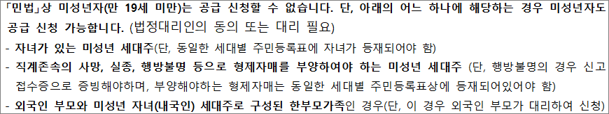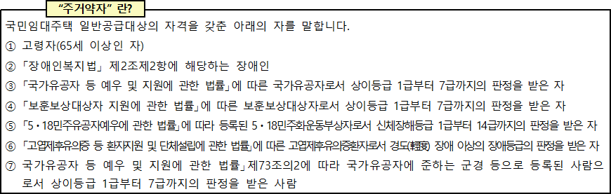 ③ 주거약자에 해당하는 사람 (고령자, 장애인)으로서 주거약자 편의시설이 설치된 주택을 희망하거나 추가 설치를 희망하는 경우에는 ‘주거약자용 주택형’을 신청하시기 바랍니다.