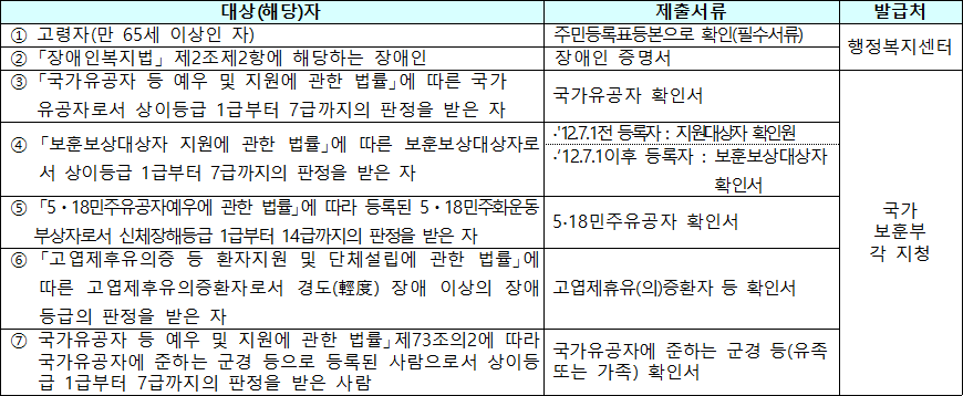 ③ 신청시 필요서류 : 장애인증명서, 국가유공자 확인서, 지원대상자 확인원, 보훈보상대상자 확인서, 5․18민주유공자 확인서, 고엽제휴유(의)증 환자 등 확인서, 국가유공자에 준하는 군경 등 확인서