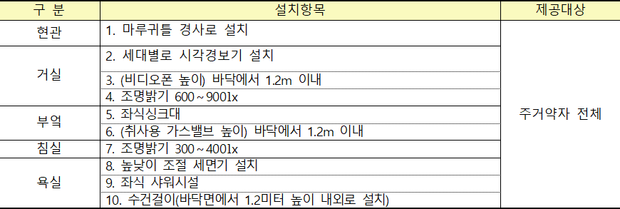 장애인의 편의증진을 위해 최초 입주자 본인 또는 부양가족 중 1명 이상이 제공대상에 해당하는 경우 신청자에 한하여 대상에 따라 아래 편의시설을 무료로 설치하여 드립니다.