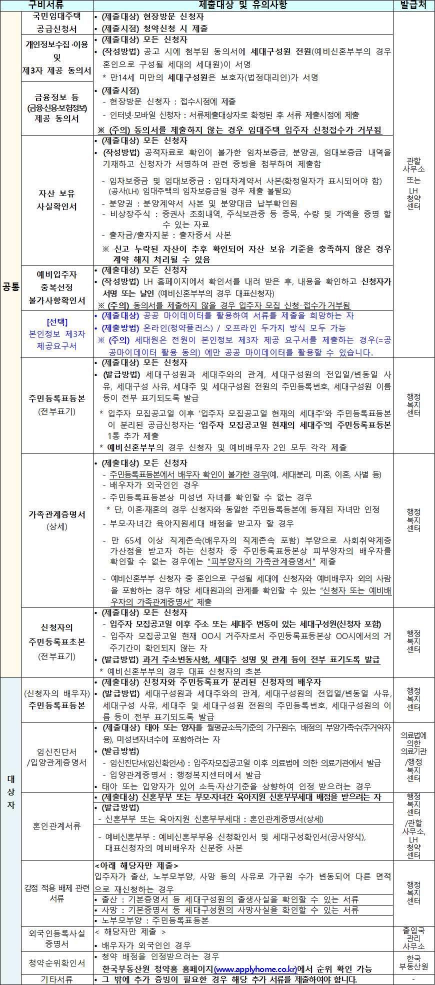 ① 아래의 제증명서류는 입주자 모집공고일 이후 발급분에 한함