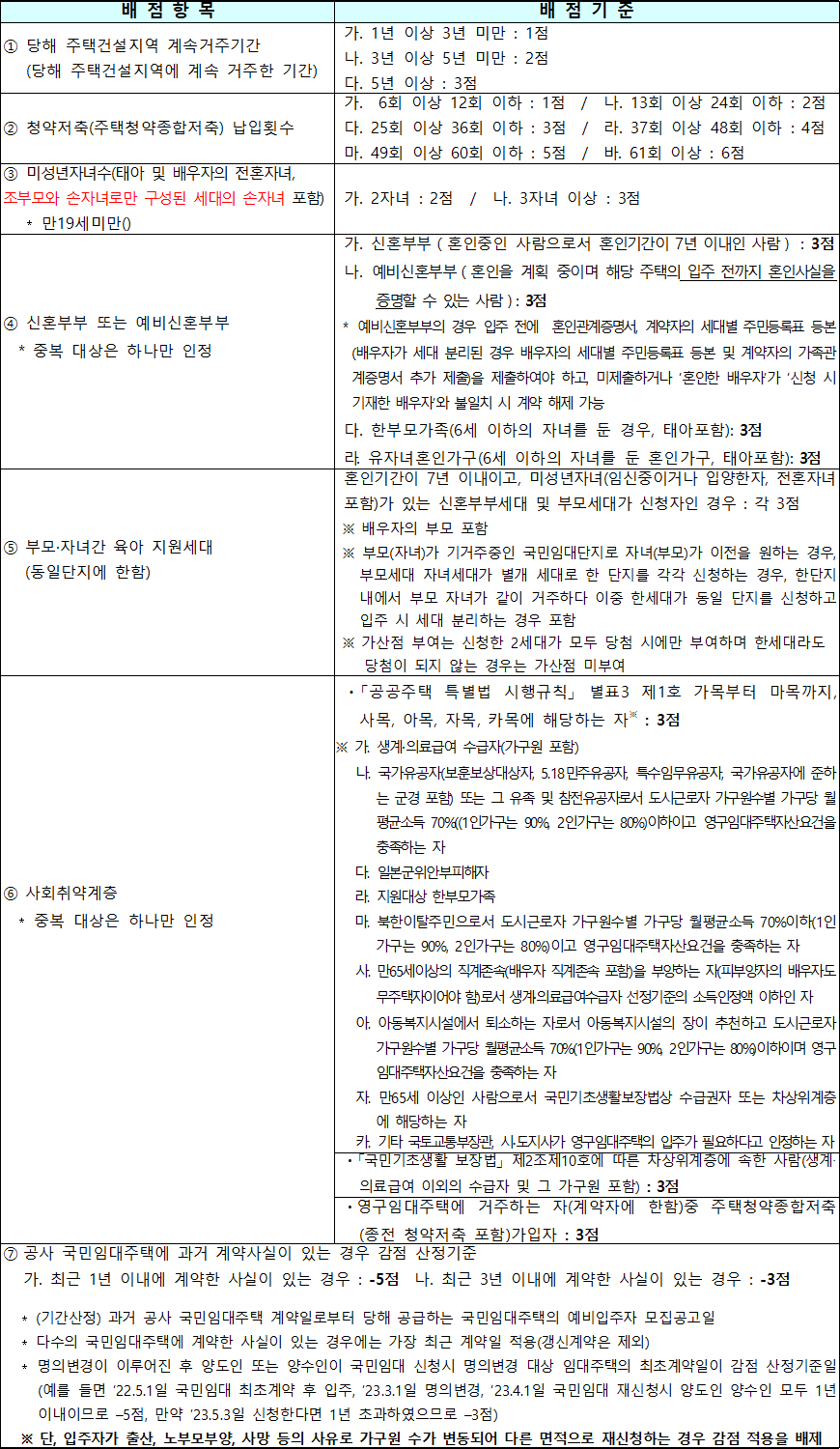 ④ 서류제출대상자는 순위 및 배점에 따라서 모집호수의 통상 1.5 ~ 2배수가 선정되며, 자격검증 후에 적격자가 모집인원 초과 시 배점이 낮은 신청자는 탈락할 수 있습니다.