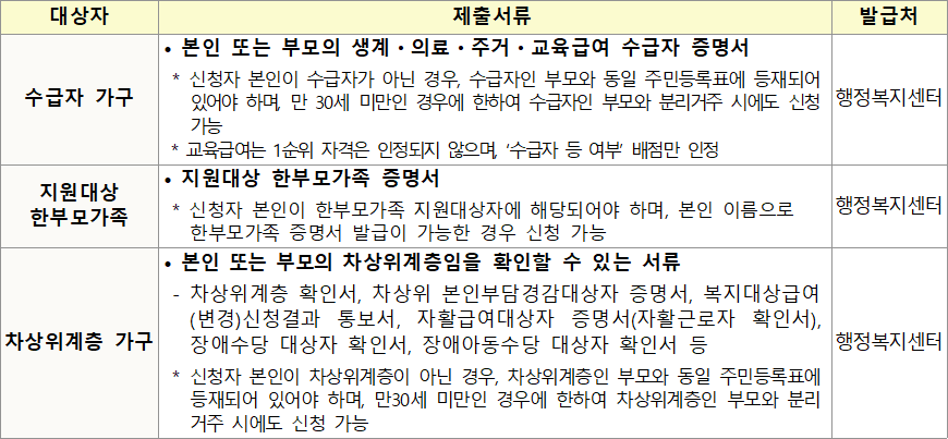 ※ 신청자 본인이 수급자, 차상위계층, 지원대상 한부모가족인 경우 추가서류 제출 불필요