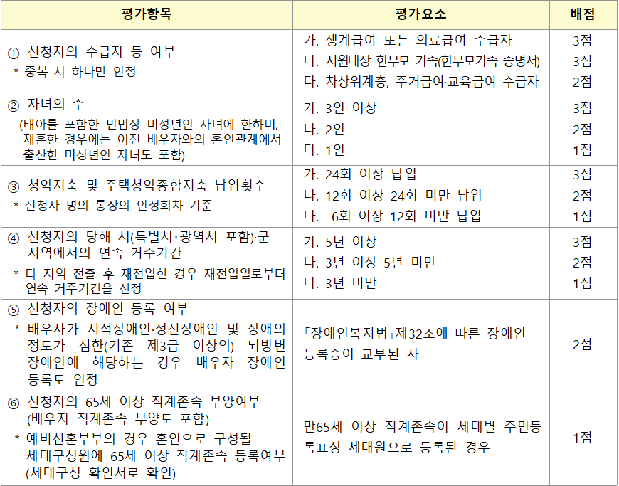 • 아래의 배점합산 점수가 높은 신청자 순으로, 동점일 경우 아래 각 평가항목의 순서에 따라 점수가 높은 자가, 동일 순서에서 점수가 동일할 경우 추첨으로 입주자를 결정합니다. (① 순위 → ② 배점 → ③ 아래 각 평가항목의 순서에 따라 점수가 높은 자 → ④ 추첨)