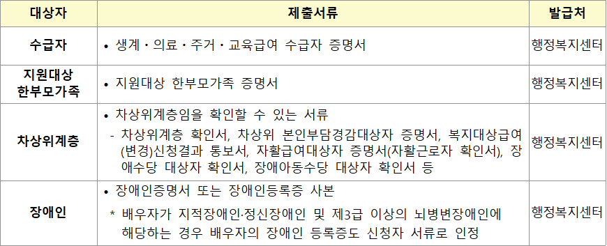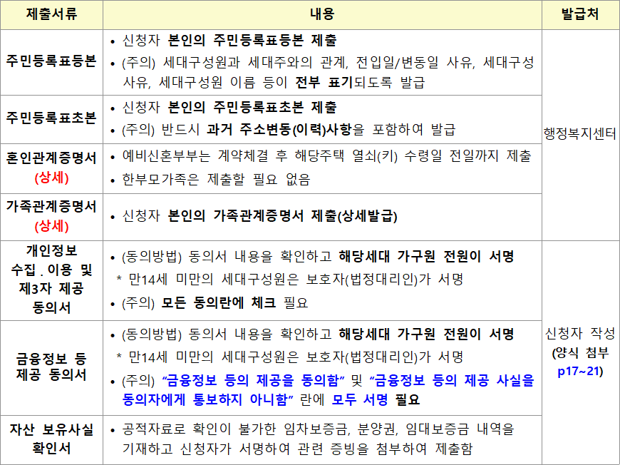 ※ 수급자, 지원대상 한부모가족, 차상위계층은 금융정보 등 제공 동의서, 자산 보유사실 확인서 제출 불필요 (단, 예비 신혼부부는 제출)