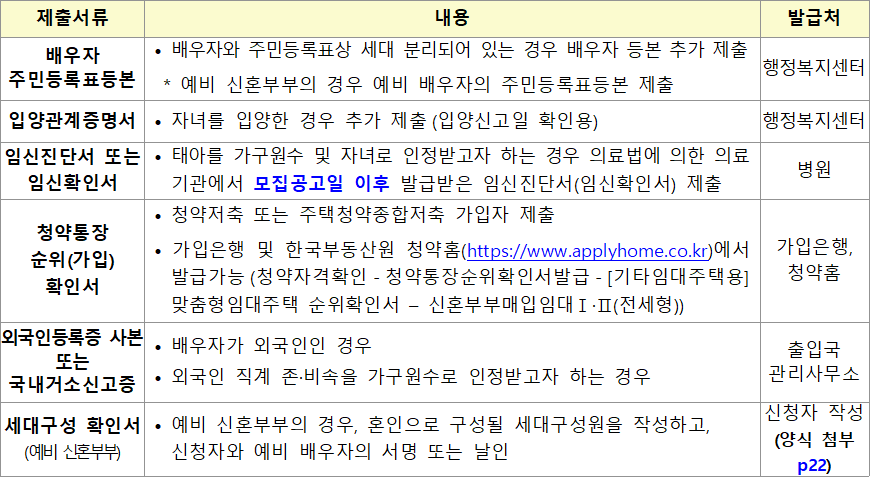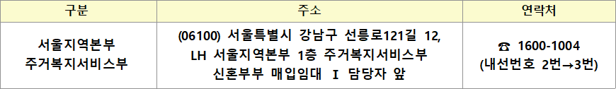 • 수신처 : (06100) 서울시 강남구 선릉로121길 12, LH 서울지역본부 주거복지서비스부 신혼부부Ⅰ 매입임대 담당자 앞