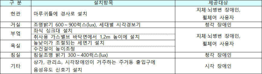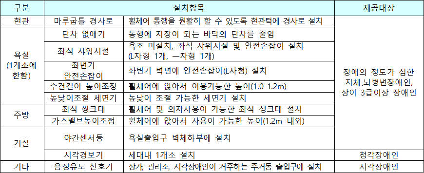 장애인의 편의증진을 위해 최초 입주자 본인 또는 부양가족 중 1명 이상이 제공대상에 해당하는 경우 신청자에 한하여 대상에 따라 아래 편의시설을 무료로 설치하여 드립니다.