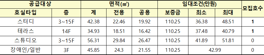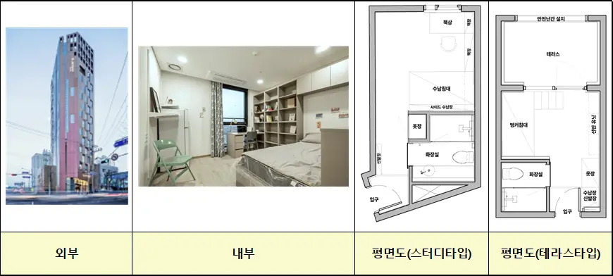 | 기타 | ▪ 청년 1인 거주공간 입니다. (공간쉐어, 동거, 전대 등 불가) ▪ 본 주택은 비 주택 시설 (숙박시설)을 리모델링하여 원룸형 도시형생활주택으로 리모델링한 주택으로, 일반적인 신축 주택건물에 비해 생활 및 소음 등의 불편함이 있을 수 있습니다. ▪ 사업자등록은 불가합니다. ▪ 기혼자, 외국인은 신청이 불가합니다. ▪ 주택 내 정기 주차 불가합니다. ▪ 임대료 및 공통관리비와 별도로 개별관리비 (가스, 전기, 수도 등 공과금)가 청구되며 비용 부과방식 등 상세내용은 추후 임대차 계약 시 개별 안내합니다. ▪ 입주 후, 주민등록법에 따라 전입신고는 14일 이내에 완료해야 합니다. |
